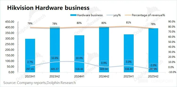 在测算出软件附加值后,通过公司年度总收入,不错获取海康威视的硬件端收入。2025年下半年海康威视的硬件端业务收入为393亿元,同比下滑4%。