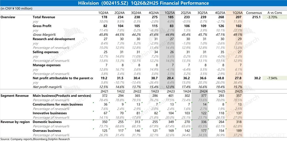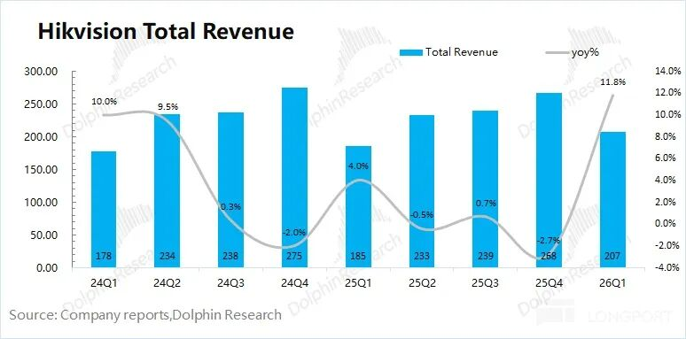 海康威视在2026年第一季度收场营收207亿元,同比高潮12%。公司营收重回两位数增长,主如果因为公司在本季度对全系家具进行了斡旋加价。