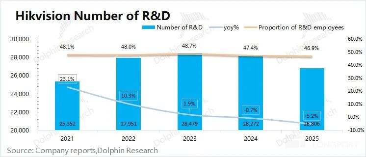 在缱绻面承压的情况下,公司进行了裁人、降费等操作。在2025年公司职工总额裁汰了2479东说念主,近十年来初次减少。至2025年末,研发东说念主员下落至2.68万东说念主,年内裁汰了1466东说念主。