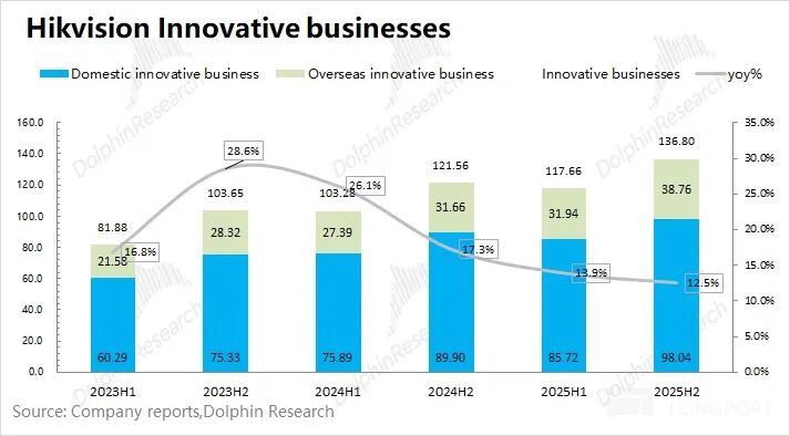 ①在境内的编削业务中,海康威视2025年下半年收场营收98亿元,同比增长9%,增速跌落至个位数。从营收体量看,编削业务当今依然主要鸠合在境内业务。