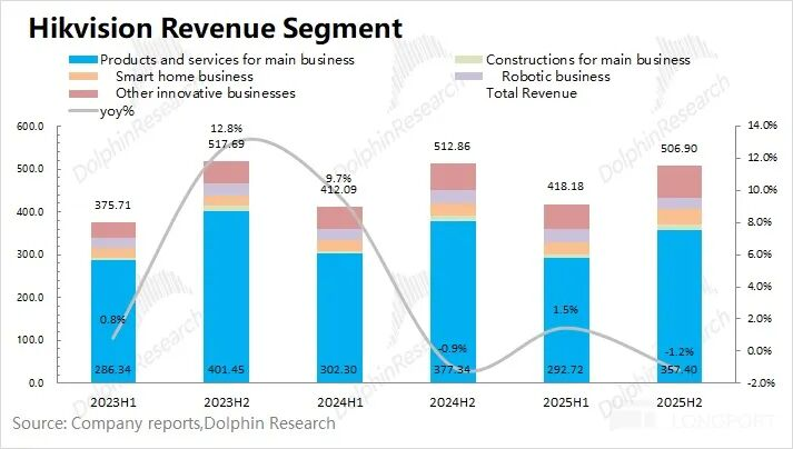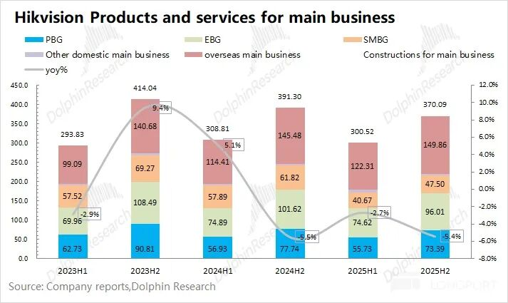 海康威视的主业家具及就业业务在2025年下半年收场营收370亿元,同比下滑5.4%。受国内主业低迷的影响,再次堕入下滑。
