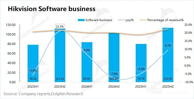海豚君通过估算2025年下半年海康威视的软件端业务收入为114亿元,同比增长10%。海康威视软件附加值,在公司总收入的比重回升至22%近邻。