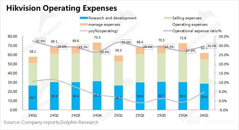 海康威视的中枢用度情况主要有销售用度、管理用度和研发用度。海康威视2026年第一季度三项中枢用度整个62亿元,同比增长5%。三项中枢用度率为30%,同比下滑2pct。