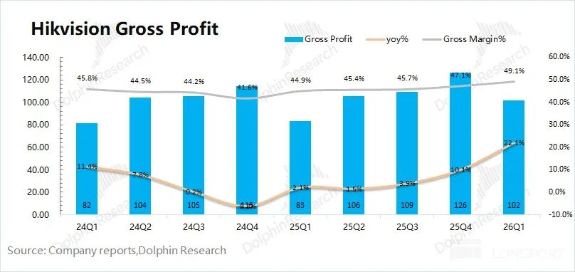 海康威视在2026年第一季度收场毛利102亿元,同比增长22%。其中公司本季度毛利率为49.1%,同比提高4.2pct。