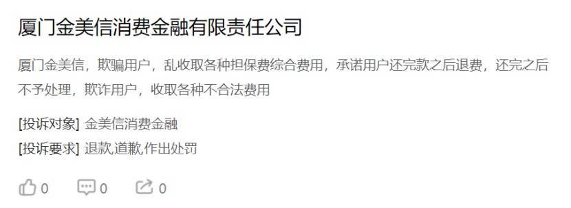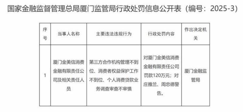 2025年12月1日,国度金融监督管束总局厦门监管局发布行政处罚信息,因第三方配合机构管束不到位、耗尽者权利保护责任不到位、个东谈主耗尽贷款业务看望审查不审慎,对金好意思信耗尽金融处以罚金120万元,同期对两名关系包袱东谈主员赐与教会刑事包袱。